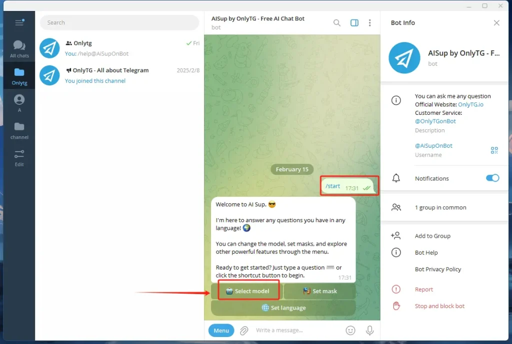 Type the command /start or click the left button and click the command /start, the welcome menu interface will appear, click the button “Select model” on this interface.